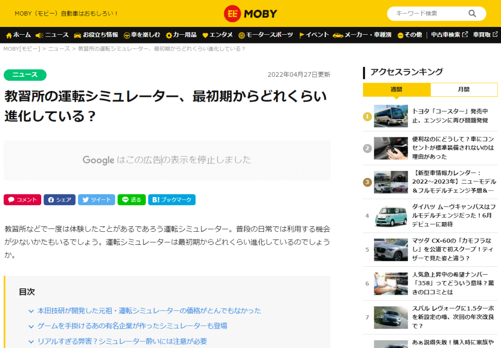 MOBY様にて運転シュミレーターの記事に掲載されました。